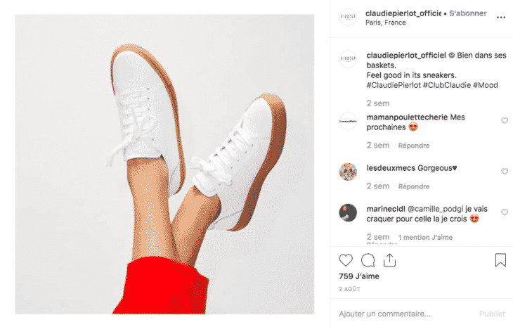 Dans l’exemple ci-dessous, Claudie Pierlot nous propose une photo de paire de chaussures sur fond beige, visant à bien faire ressortir les atouts du produit.