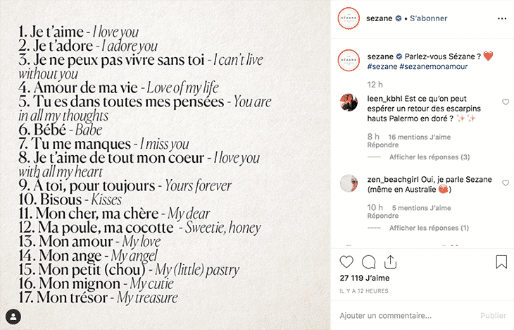 La marque de vêtements Sézane a publié une image ludique où elle recense des expressions liées au domaine de l’amour et du couple.