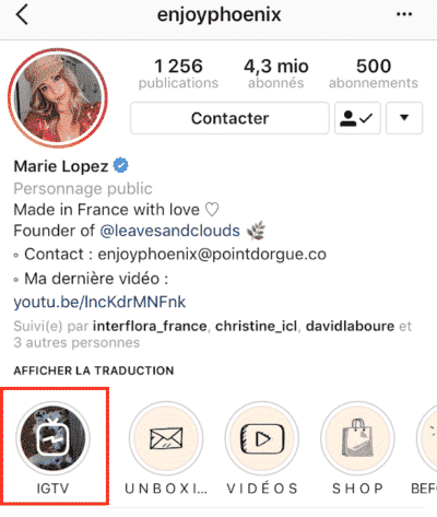 Vous pouvez regarder des vidéos IGTV sur l’application Instagram, sur l’application dédiée (IGTV) ou en cliquant sur le bouton IGTV apparaissant sur un profil d’utilisateur :