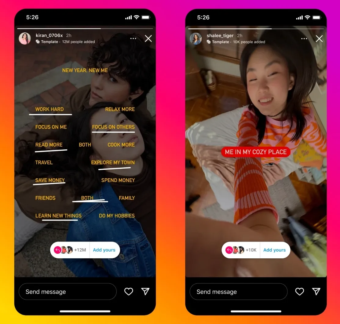 Les modèles d’autocollants invitent d’autres utilisateurs à contribuer à une Story, via une invite « Ajoutez la vôtre », ce qui est un moyen simple de susciter un engagement et une interaction plus directs.