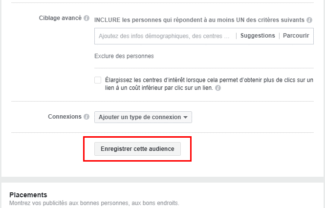 Dès que vous avez paramétré tous les critères de ciblage, cliquez sur le bouton « Enregistrer cette audience », juste avant l’encart « Placements » :