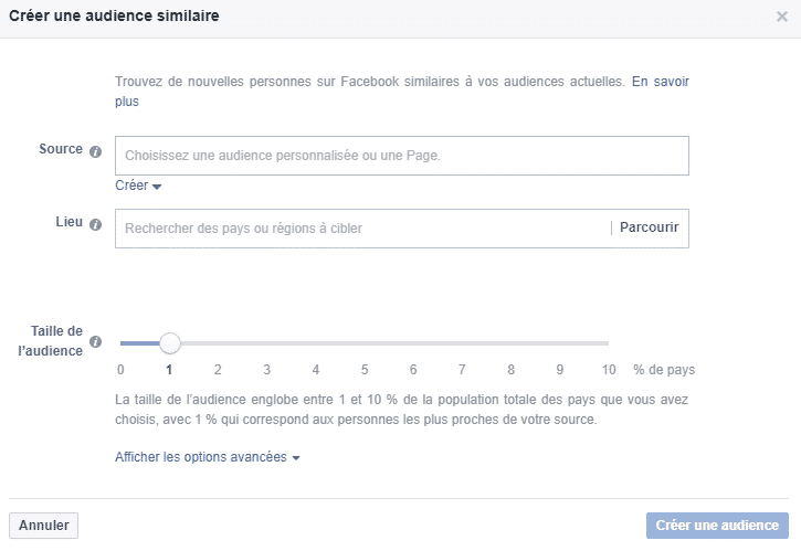 En dernier lieu, sélectionnez la taille de l’audience. Plus le pourcentage est réduit, plus le profil est proche de la source. Si vous êtes sur un marché de niche, il est intéressant de conserver une taille de 1 ou 2. En revanche, si votre entreprise s’adresse à un public assez large, vous pouvez agrandir l’audience.