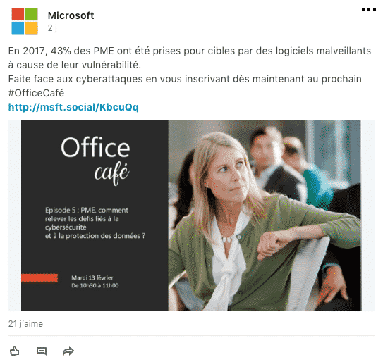 Prenons l’exemple de Microsoft. Cette entreprise conçoit des services pour des particuliers (familles, étudiants…), mais aussi pour les professionnels (TPE, PME, multinationales…). Sur LinkedIn, celle-ci choisira de ne s’adresser qu’à cette deuxième cible. Elle axe alors ses publications sur la façon dont les entreprises peuvent se défendre face aux logiciels malveillants sur Internet :