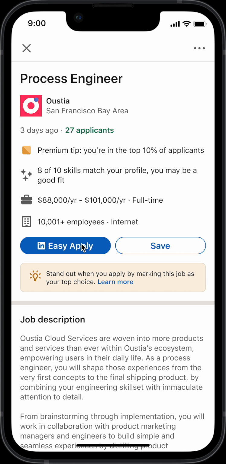 Nous avons commencé à tester Top Choice Jobs avec les abonnés Premium, et nous évaluerons une offre limitée aux membres gratuits dans les semaines à venir. À partir de certaines offres d’emploi Easy Apply LinkedIn, vous trouverez la case à cocher Top Choice Jobs juste en dessous du module de CV dans le flux des demandes d’emploi. Nous serions ravis de connaître votre avis et vos commentaires !