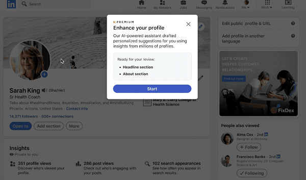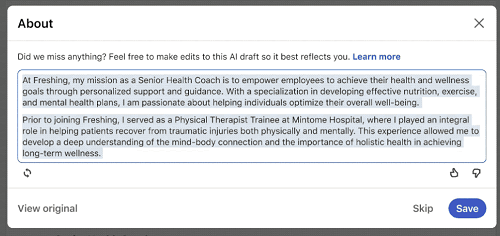 Comme vous pouvez le voir dans cet exemple, une nouvelle fonctionnalité de LinkedIn Premium sera l’option de générer un titre ou un résumé « À propos » pour votre présence sur LinkedIn.