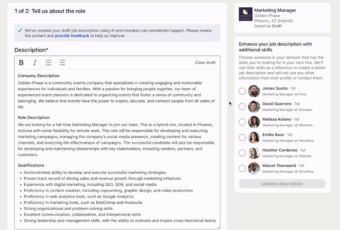 La description de poste générée par l’IA comprendra des compétences clés pour compléter la liste, tandis que vous pourrez également ajouter des compétences et des caractéristiques plus spécifiques basées sur les profils de vos employés existants ou sur les personnes de votre réseau, afin de personnaliser davantage la vue d’ensemble.
