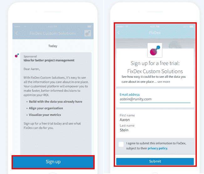 Le réseau social souhaite faciliter la collecte d’informations pour les annonceurs utilisant les Inmails sponsorisés grâce aux formulaires Lead Gen.