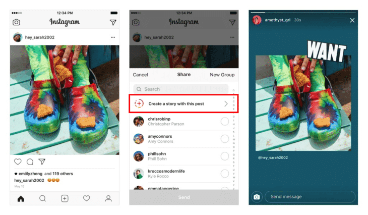 Une fonctionnalité supplémentaire se déploie ces derniers jours pour vous permettre d’ajouter une publication classique dans une Story. Pour cela, il vous suffira simplement de cliquer sur le petit avion à côté de la bulle et du coeur, pour obtenir les écrans ci-dessous :