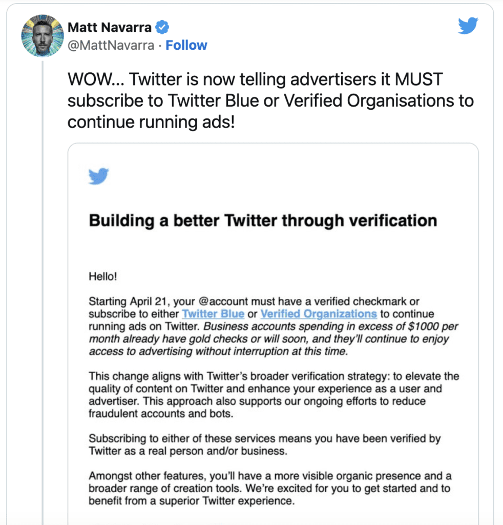 Il semble qu’Elon Musk va tenter d’augmenter les revenus d’abonnement de Twitter par la force brute, la plateforme informant désormais tous les annonceurs qu’ils devront s’inscrire à Twitter Blue ou Verification for Organizations pour pouvoir continuer à diffuser des publicités dans l’application.