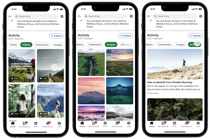 Grâce aux dernières mises à jour, les utilisateurs auront davantage de possibilités d’intégrer des éléments visuels dans la présentation de leur profil, notamment la possibilité d’afficher des images, des vidéos et des articles dans une présentation plus esthétique au sein de la section « Activité ».