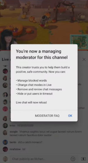 YouTube a également introduit un nouveau rôle de modérateur, qui offre des actions de modération étendues pour le chat en direct. Les créateurs peuvent désormais nommer un modérateur existant ou en ajouter un nouveau pour le rôle de « modérateur en chef » dans les paramètres de leur chaîne. Les modérateurs de gestion pourront alors aider dans tous les aspects de la modération, fournissant ainsi un autre moyen d’assistance pour les flux en direct sur YouTube.