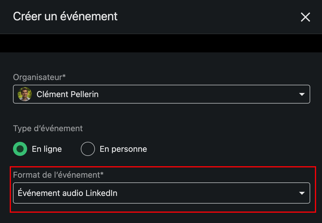 Pour cela, il vous faudra vous rendre au niveau de l’écran de création d’un évènement, puis choisir dans « Format de l’évènement » le choix « Evénement audio LinkedIn ».