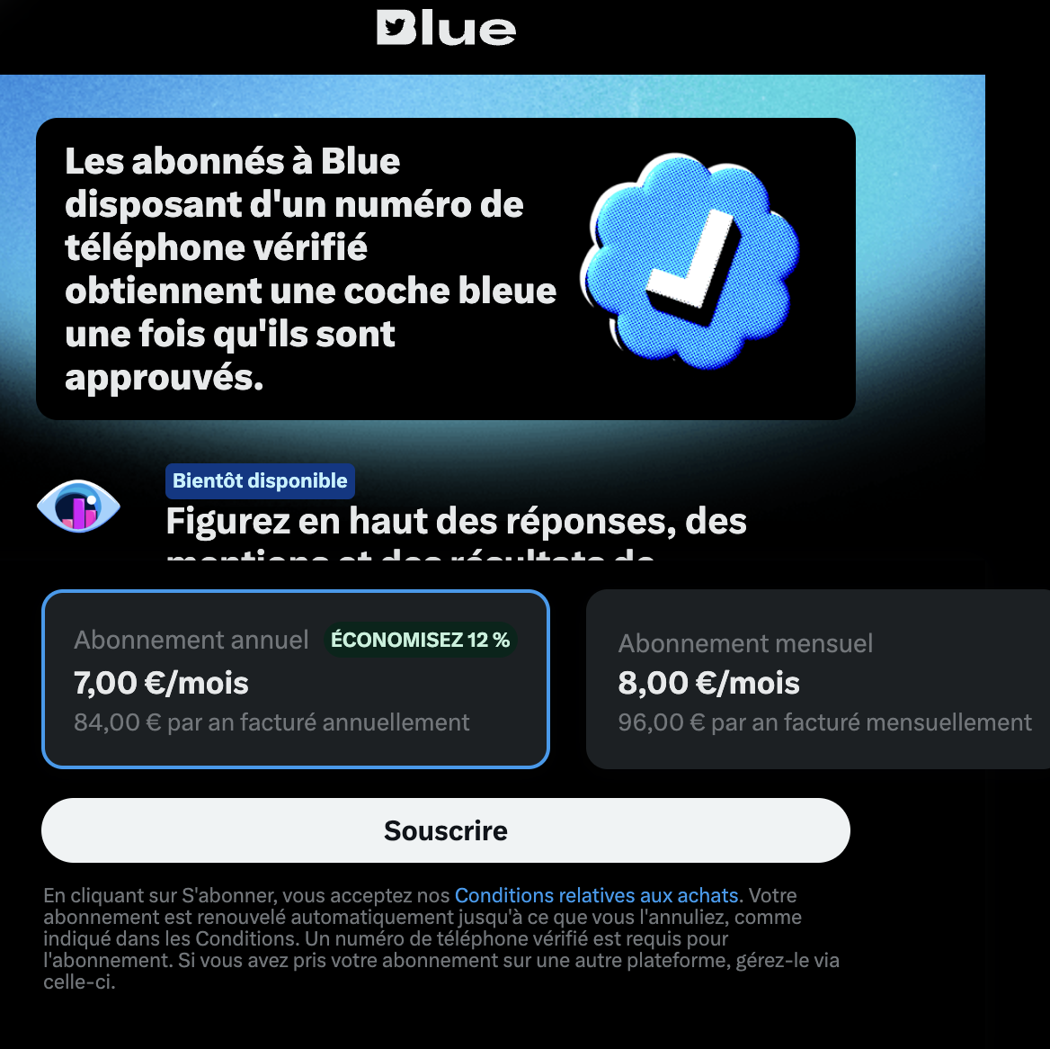 Le tarif de Twitter Blue démarre à partir de 7€ par mois.