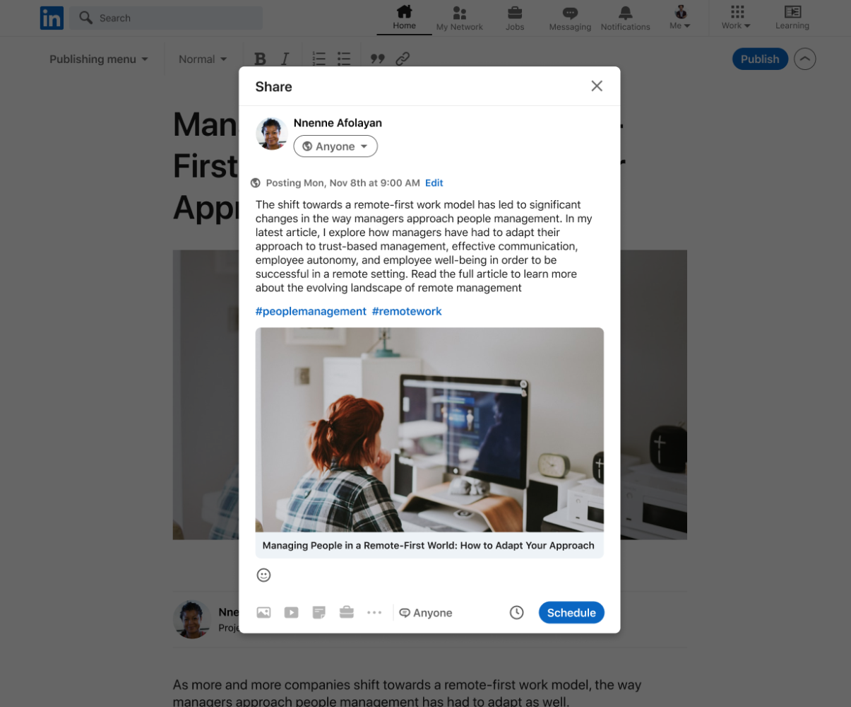 Dans le prolongement de l’arrivée de la fonctionnalité de programmation des posts LinkedIn des profils personnels & pages entreprise, il sera bientôt possible de programmer la diffusion d’articles.