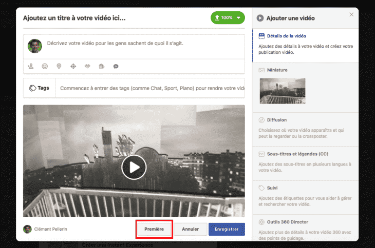 Pour bénéficier de cette option, il vous suffit de sélectionner une vidéo à partager dans une publication classique, puis cliquer sur le bouton « Première » tel que ci-dessous :
