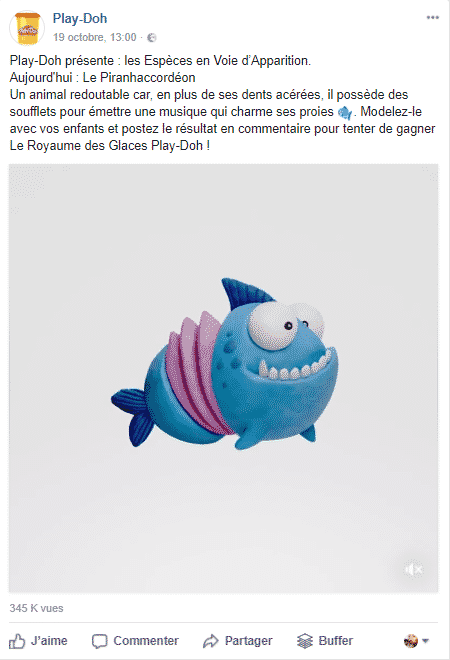 Pour accentuer l’impact de sa campagne, Play-Doh publie régulièrement un nouvel animal sur sa page Facebook. Elle organise aussi des concours dans lesquels elle demande de partager les créations des enfants.