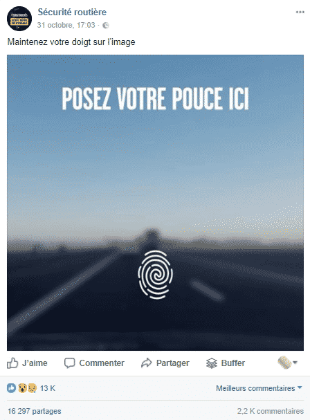 Depuis fin octobre, une publicité sponsorisée fait le tour de Facebook. Dans celle-ci, vous êtes invité à poser le pouce. L’animation se déclenche : vous êtes sur la route, vous doublez des camions et soudain, c’est l’accident ! L’effet est très réel, vous avez vraiment l’impression d’être dans la voiture et d’heurter un obstacle.