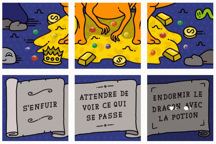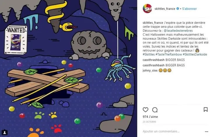 Il existe une mécanique de jeu particulièrement captivante sur Instagram : la chasse aux trésors. Il s’agit de créer plusieurs comptes sur lesquels la grille Instagram représente un décor. Il faut alors chercher un objet spécifique… Pour Halloween, Skittles a utilisé cette technique pour que les utilisateurs retrouvent les Skittles Darkside. Mais pour y parvenir, il faut s’aventurer dans la salle des ténèbres…