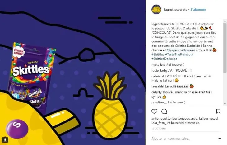 Lorsque l’instagrammeur trouve enfin le paquet de Skittles Darkside, il ne reste plus qu’à commenter le post pour espérer gagner le concours.