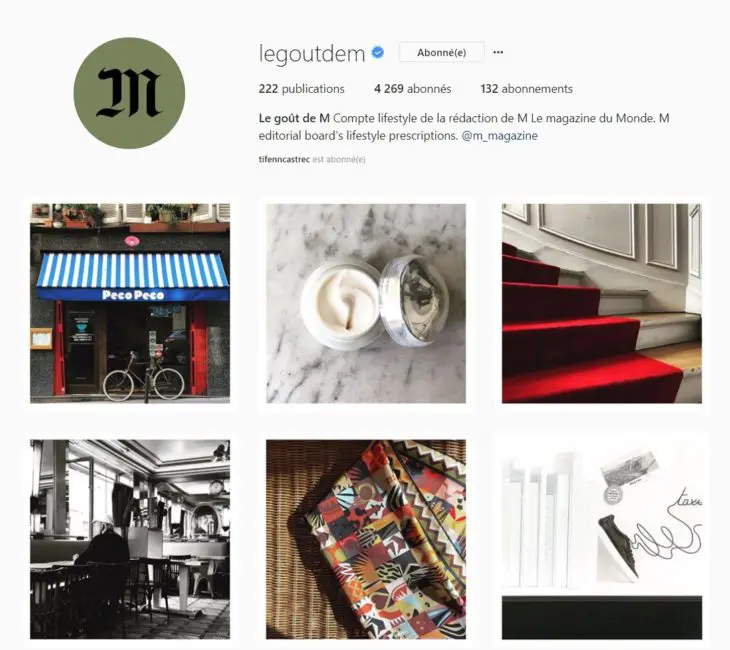 Le Monde lance un compte Instagram lifestyle, inspiré par son magazine « M », intitulé @legoutdem. L’objectif affirmé est de partager les goûts et les couleurs de la rédaction en matière de décoration, cuisine, événement, mode, accessoires, bijoux…