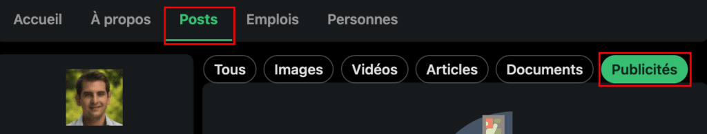 Il vous faudra ensuite vous rendre au niveau de leurs publications, puis filtrer en cliquant sur « Publicités » :