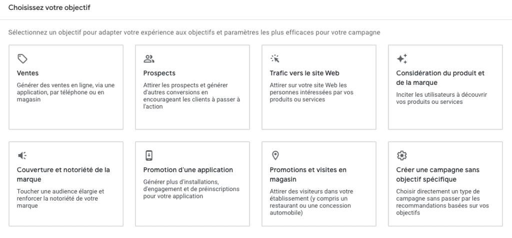 La sélection de votre objectif de campagne Google Ads est une étape cruciale dans l’optimisation des performances de celle-ci, en fonction des résultats importants à atteindre pour votre entreprise.