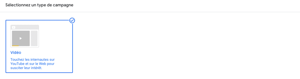 Le seul type de campagne disponible pour cet objectif est « Vidéo ».