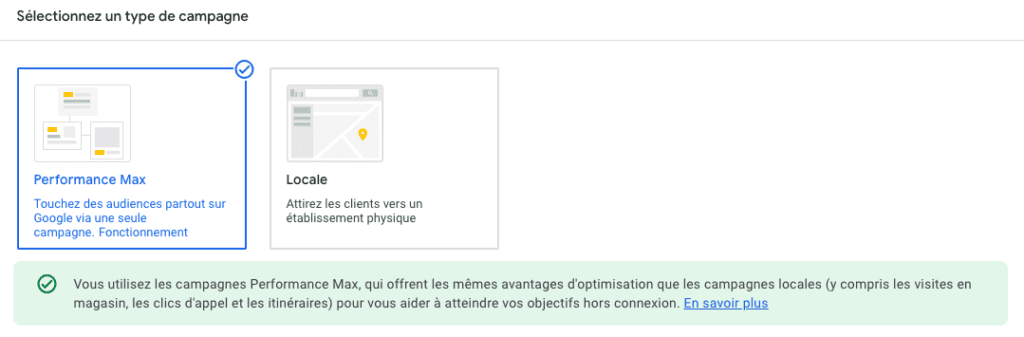 Seul le type de campagne « Performance Max » est disponible pour l’objectif « Promotions et visites en magasin » (le type « Locale » sera bientôt supprimé).