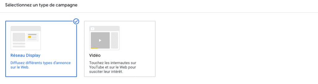 La finalité de cet objectif est de toucher une audience élargie et renforcer la notoriété de votre marque. Il diffère de l’objectif précédent par la présence du type de campagne « Display » en addition de « Vidéo ».