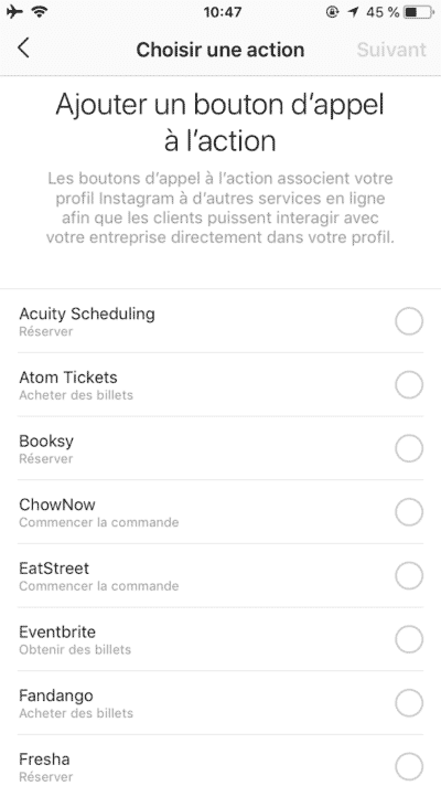 Un bouton d’action connecte votre compte Instagram avec d’autres services en ligne tels que Yelp ou Eventbrite afin que vos clients puissent effectuer des actions telles qu’acheter des tickets ou prendre une réservation sans quitter votre profil.