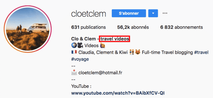 Par exemple, les influenceurs Clo & Clem ont ajouté les mots-clés « Travel videos » dans leur nom afin d’être mieux trouvés grâce à ceux-ci :