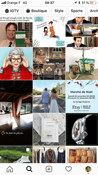 - les interactions : avec quelles publications avez-vous déjà interagi par le passé ? Si vous likez, commentez ou enregistrez des posts provenant majoritairement des mêmes personnes / marques, leurs Stories seront privilégiées lorsqu’il s’agira de définir l’ordre de celles-ci sur l’accueil de l’application. Une manière concrète d’avoir une idée des contenus sur lesquels nous interagissons le plus est d’observer notre rubrique Explorer.