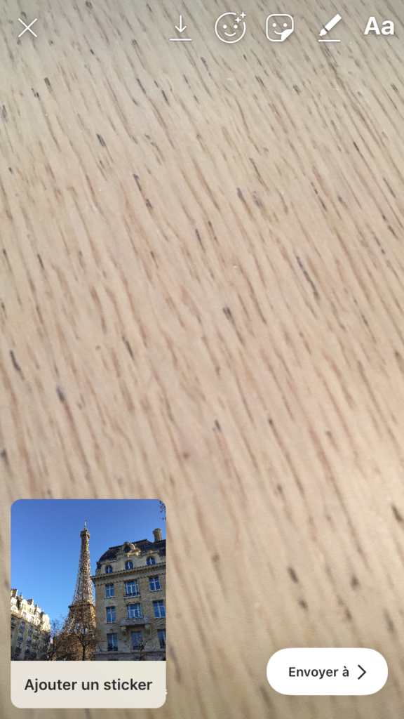 La deuxième manière d’ajouter un visuel, si jamais l’option d’ajouter un sticker n’est pas proposée, est de passer par l’éditeur de texte accessible en haut à droite de l’écran via « Aa ».