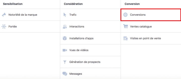 Dans le gestionnaire de publicités, créez une nouvelle campagne et sélectionnez l’objectif « Conversions » :