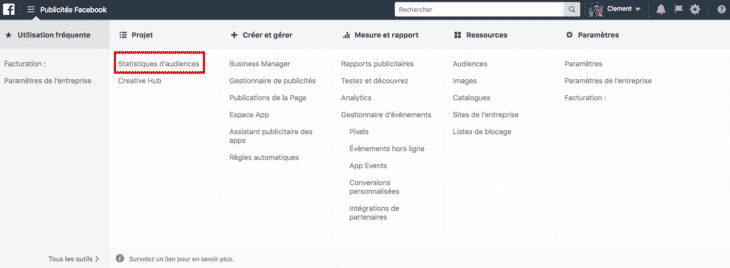 Une autre option est de créer une audience personnalisée reposant sur l’engagement des internautes sur votre page Facebook. Pour créer celle-ci, rendez-vous dans votre Business Manager et sélectionnez « Audiences » dans la liste des outils.
