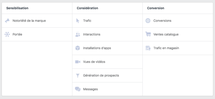 Les campagnes publicitaires Facebook soutiennent cette approche avec trois catégories d’objectifs publicitaires distincts :