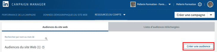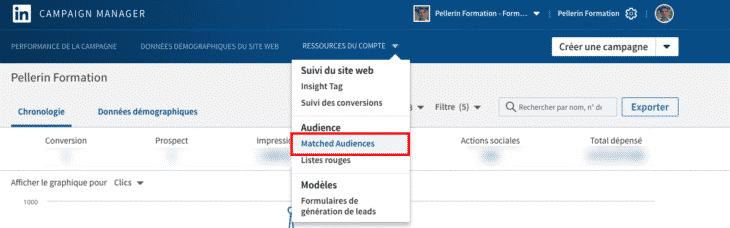 Dans votre Campaign Manager, cliquez sur « Ressources du compte » puis sur « Matched Audiences » pour créer votre première audience de visiteurs de votre site Internet :