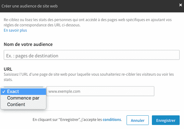 Si vous souhaitez recibler l’ensemble des visiteurs de votre site, il vous faudra choisir « Commence par » puis renseigner le nom de votre site Internet. Vous pourriez cependant vouloir cibler uniquement les personnes ayant visité votre boutique en ligne ou les pages « Services ». Il vous faudrait alors utiliser « Contient ».