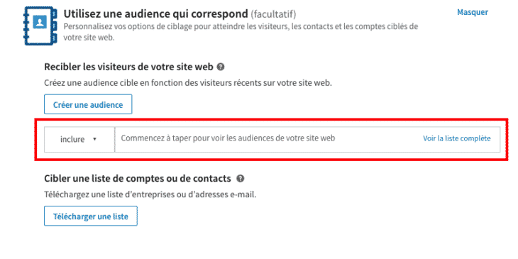 Dès lors que vous avez collecté suffisamment de données sur les visiteurs de votre site, il est temps désormais de lancer votre campagne publicitaire en exploitant celles-ci. Pour ce faire, créez une publicité LinkedIn de manière classique jusqu’à la définition des critères de ciblage.