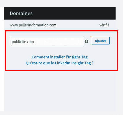 - LinkedIn attend qu’une URL soit visitée pour procéder à la vérification du bon chargement de l’Insight Tag. Une fois cela effectué, une mention « Vérifié » sera affichée à côté de votre nom de domaine.