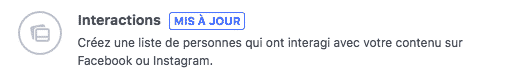Une audience personnalisée de type « Interactions »est une liste de personnes qui se sont engagées avec votre contenu sur Facebook & Instagram. La puissance de cet outil est que n’importe quelle personne qui a interagi précédemment avec votre marque fait désormais partie de votre audience chaude.