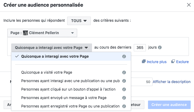 Quand vous créez une audience personnalisée basée sur les personnes ayant interagi sur votre page Facebook, vous pouvez choisir entre 6 différentes options :