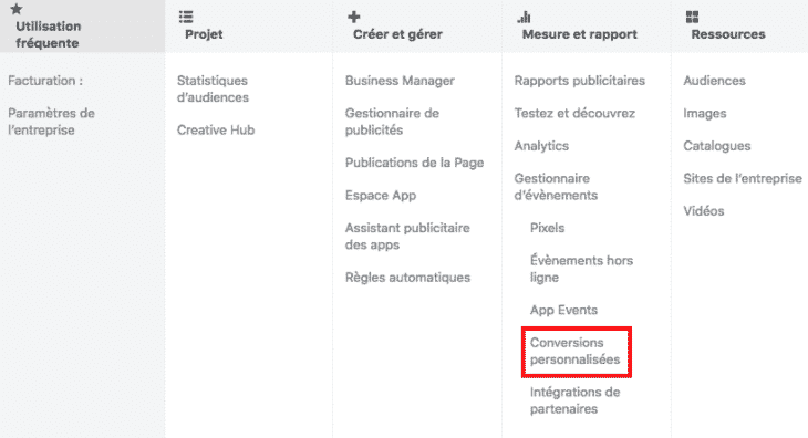 Rendez-vous dans votre Business Manager Facebook puis dans la liste des outils proposés sélectionnez « Conversions personnalisées » :