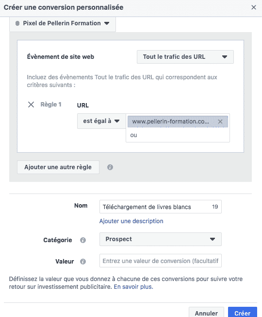 Une fois que le pixel est actif, vous aurez besoin de créer une conversion personnalisée. Partons du principe que vous souhaitez mesurer le nombre de téléchargements de livres blancs sur votre site Internet.