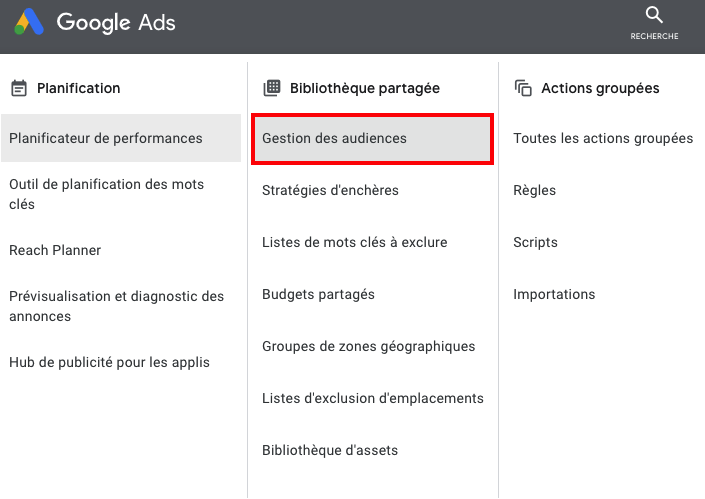 Cliquez sur « Outils et paramètres » de votre interface Google Ads puis sur « Gestion des audiences » dans la colonne « Bibliothèque partagée ».