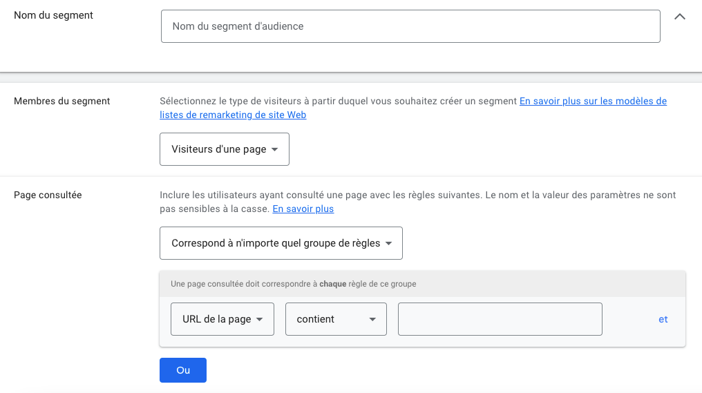 Renseignez votre audience de retargeting dans la rubrique « Segments », comme nous le voyons ci-dessous :