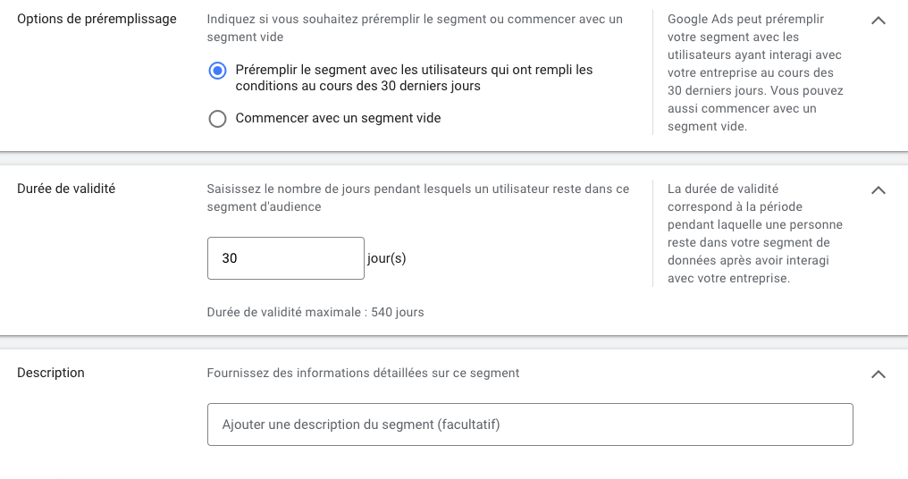 - définir les options de pré-remplissage (indiquez si vous souhaitez pré-remplir le segment ou commencer avec un segment vide)
