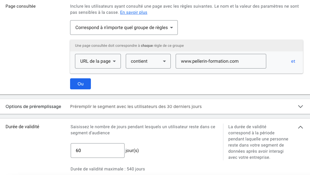 Dans le cas où vous souhaitez faire apparaître vos publicités auprès des personnes ayant visité votre site Internet sur les 60 derniers jours par exemple, voici ce que vous devez faire :