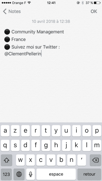 C’est très simple : dans un premier temps, il vous sera nécessaire de lancer l’application « Notes » de votre Smartphone. Ensuite, il vous faudra taper ligne par ligne votre biographie en vous servant par exemple de smileys ou bullet points, comme je vous en propose un exemple ci-dessous :