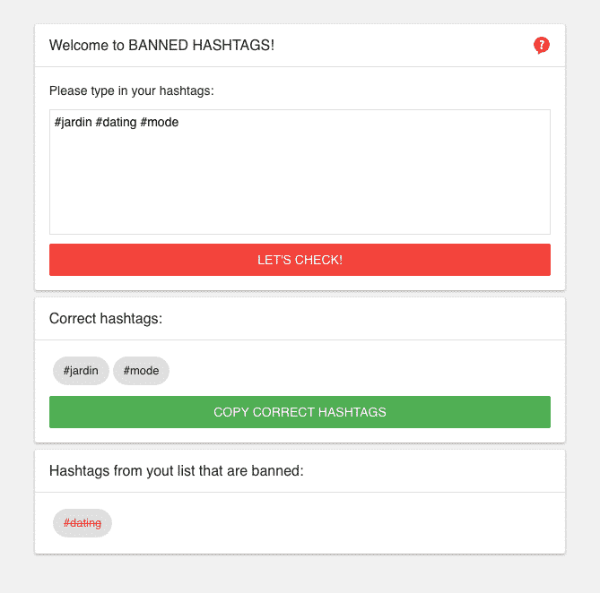 Dans le cas ci-dessus, les termes #jardin et #mode ont été validés, mais pas l’expression #dating. Il vous faudra absolument faire vos recherches en prenant en compte le fait que l’outil est anglophone, alors testez vos hashtags d’abord en anglais pour être sûr.